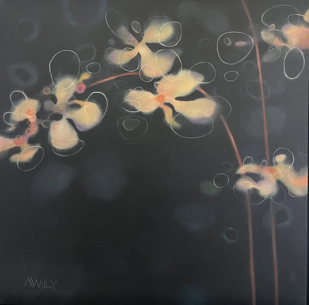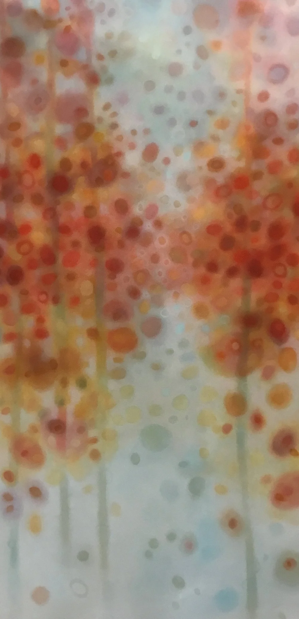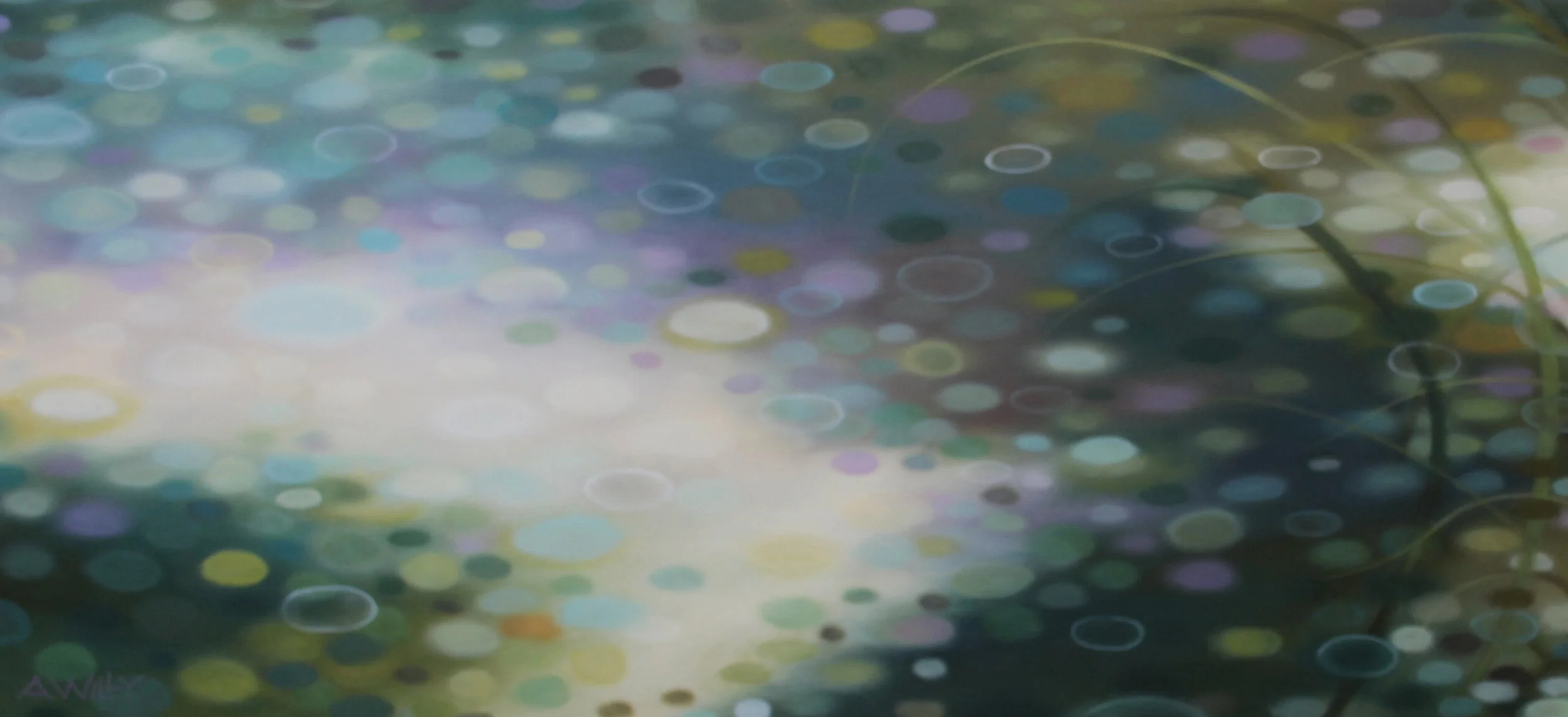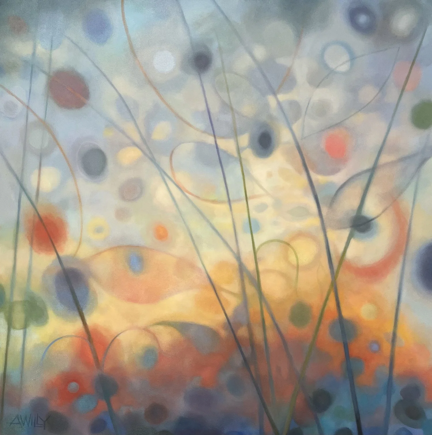 Many of my paintings are seen as abstracts, but the inspiration always derives from natural elements in the landscape. I paint in layers of oil, weaving ellipses, spheres and circles within the art. This layering helps me achieve an out-of-focus, undefined quality giving the viewer a softer look at the world.