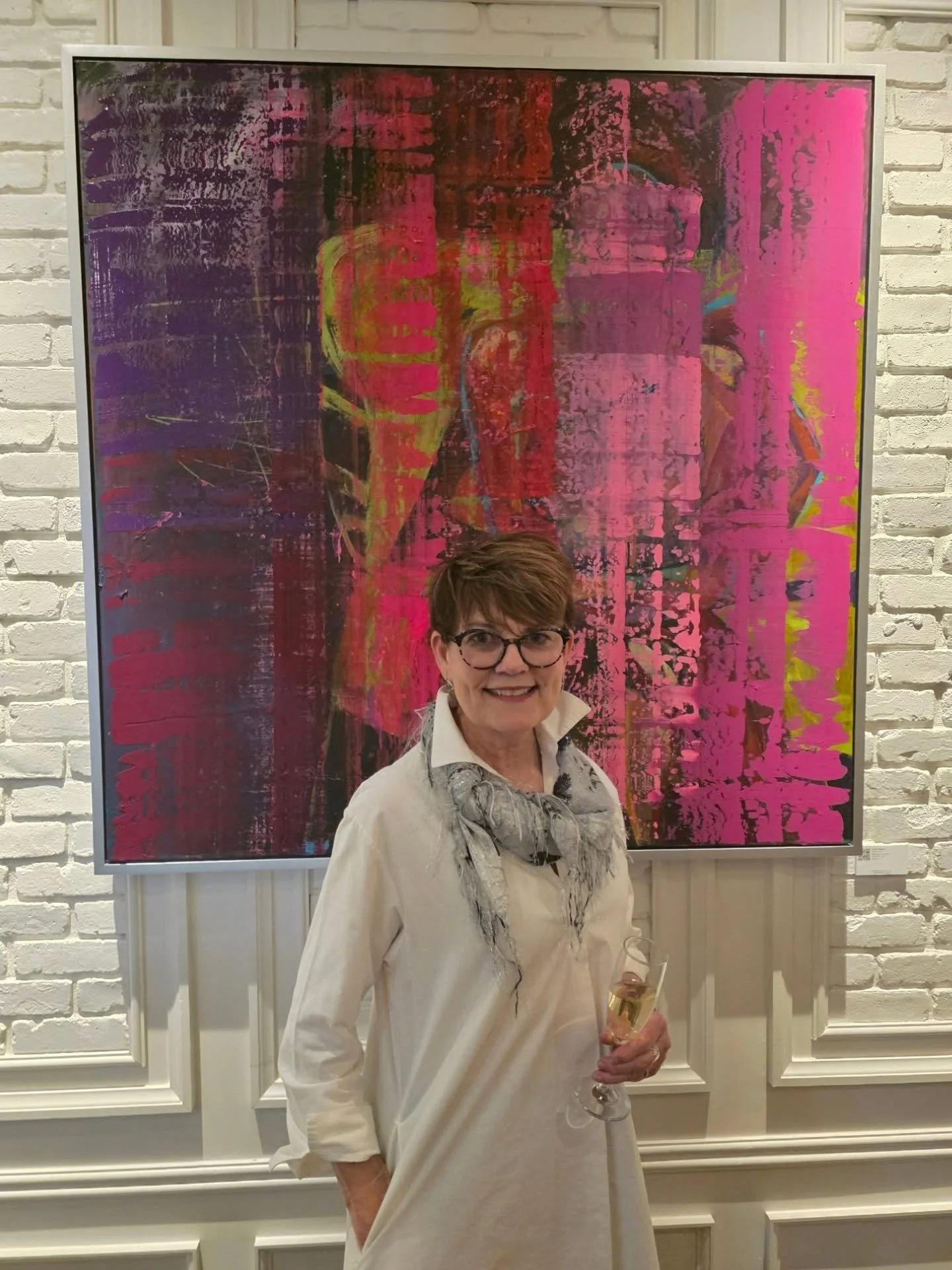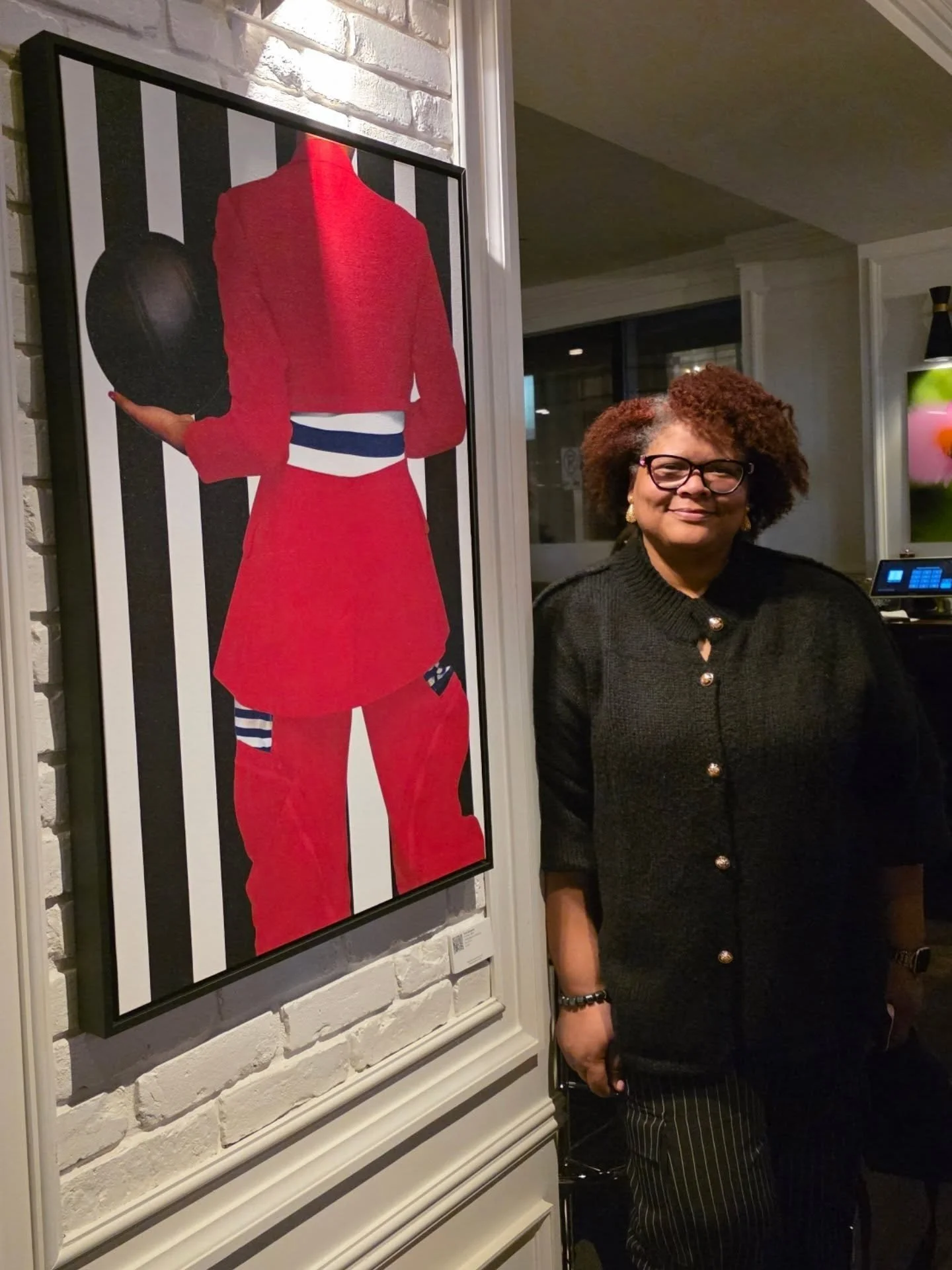 Faith Blackwell exhibited Forward, a bold photographic piece printed on canvas. Dominated by black, white, and red, the work reflects her pop-art style and strong graphic sensibility. The piece was purchased during the show.