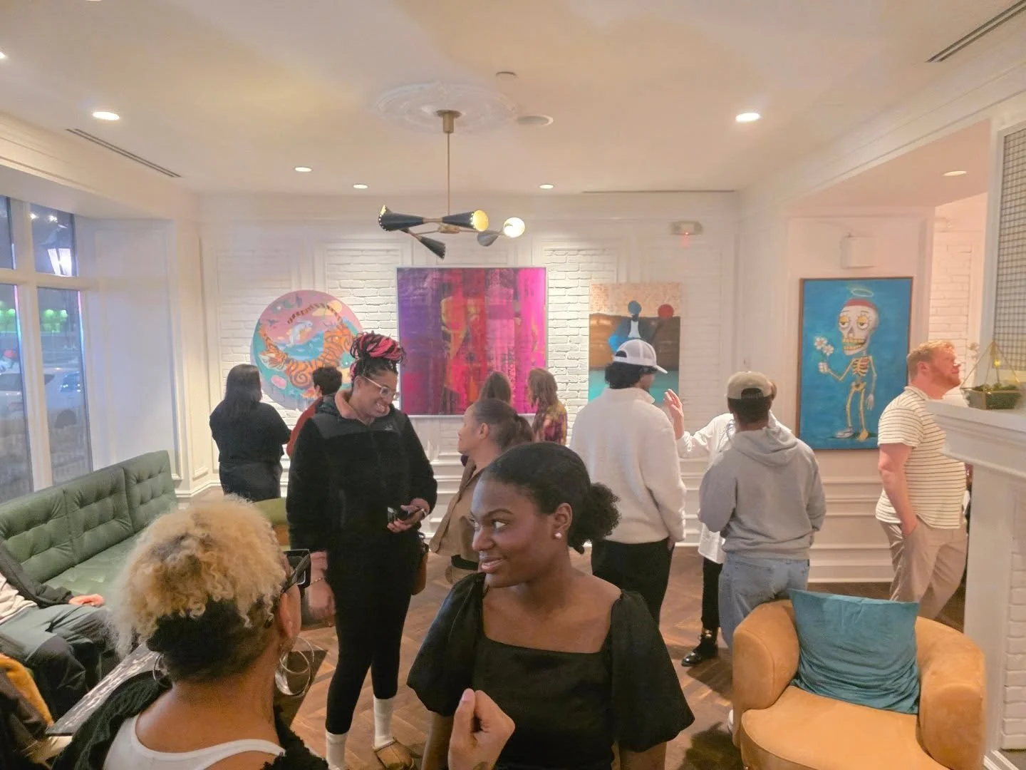 The opening reception drew a supportive crowd. Guests mingled at the hotel with drinks in hand while exploring artwork displayed throughout the main floor. Pieces hung in the front sitting room and continued through the restaurant and bar areas, creating a gallery-like experience woven into the hotel environment. A hidden speakeasy in the basement added to the atmosphere, giving visitors another place to gather during the evening.