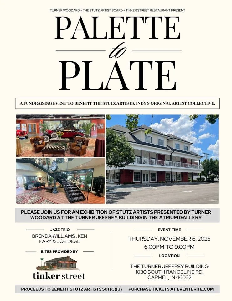 Palette to Plate was a special and successful evening on November 6, 2025 celebrating Indy’s creative spirit, bringing together art lovers, musicians, chefs, and community supporters for a Stutz Artists exhibit and benefit at the iconic Turner Jeffrey Building and Car Museum. Hosted in collaboration with Turner Woodard, the Stutz Artist Association, and Tinker Street Restaurant, the event featured original artwork by Stutz Artists available to view and purchase, live jazz, inspired bites, and a full bar—all in support of Indy’s original artist collective.