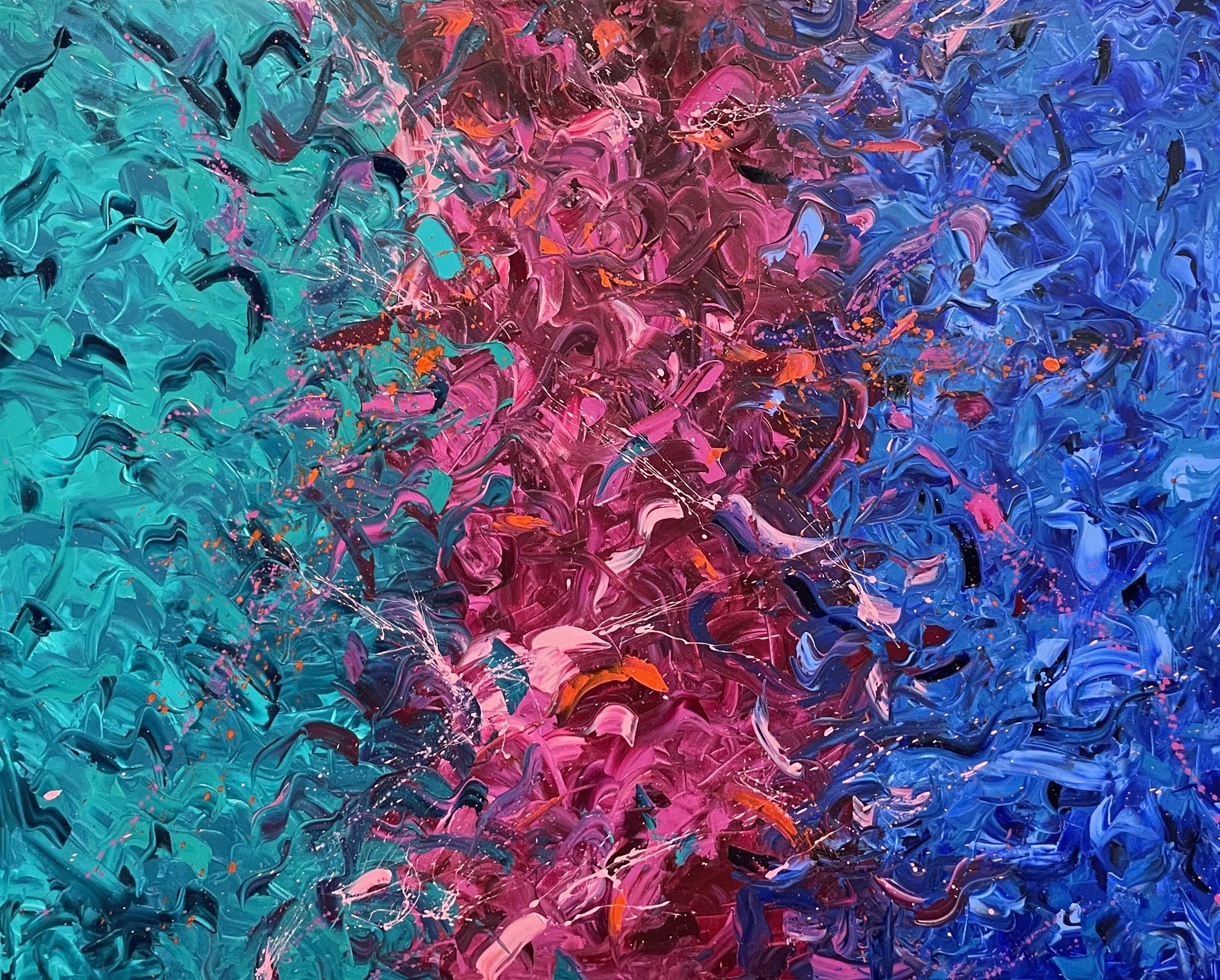 Through energy, movement, and form, Stuart’s paintings convey both ephemeral moments and enduring stories, reflecting the limitless potential of color and life on the planet. While wild and abstract on the surface, each piece is grounded in deliberate structure and intention. Colors—such as aqua, fuchsia, periwinkle, and tangerine—are treated as living forces, guiding the work and shaping what ultimately emerges on the canvas.